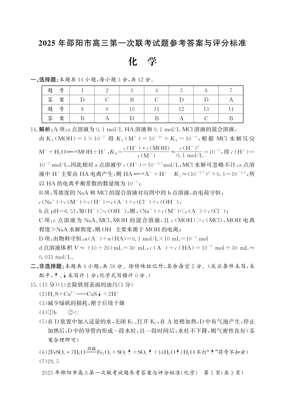 2025年邵阳市高三第一次联考试题参考答案与评分标准(化学)第1页(共3页)2025年邵阳市高三第一次联考试题参考答案与评分标准化学一、选择题:本题共14小题,每小题3分,共42分。题号1234567答案DCBCDDA题号89101112131...