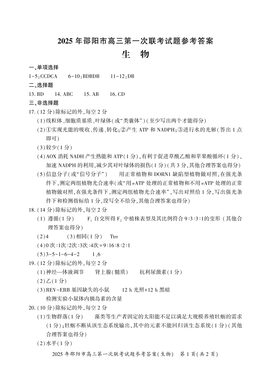 2025年邵阳市高三第一次联考试题参考答案(生物)第1页(共2页)2025年邵阳市高三第一次联考试题参考答案生物一、单项选择1-5:CCDCA6-10:BDBDB11-12:DB二、选择题13.BD14.ABC15.AB16.CD三、非选择题17.(12分)除标记的...
