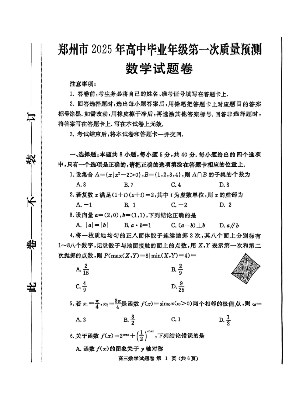 河南省郑州市2025届高三第一次质量预测数学.pdf_第2页