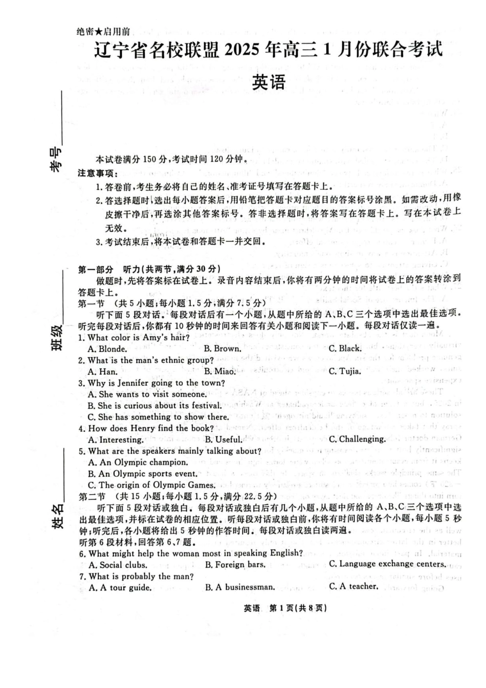 辽宁省名校联盟2024-2025学年高三上学期1月份联合考试英语试题.pdf_第1页
