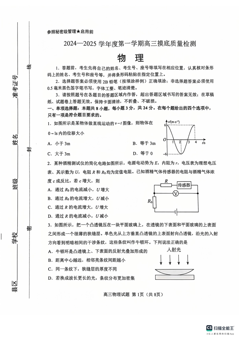 山东省淄博市2024-2025学年第一学期高三期末摸底质量检测物理试卷.pdf_第1页