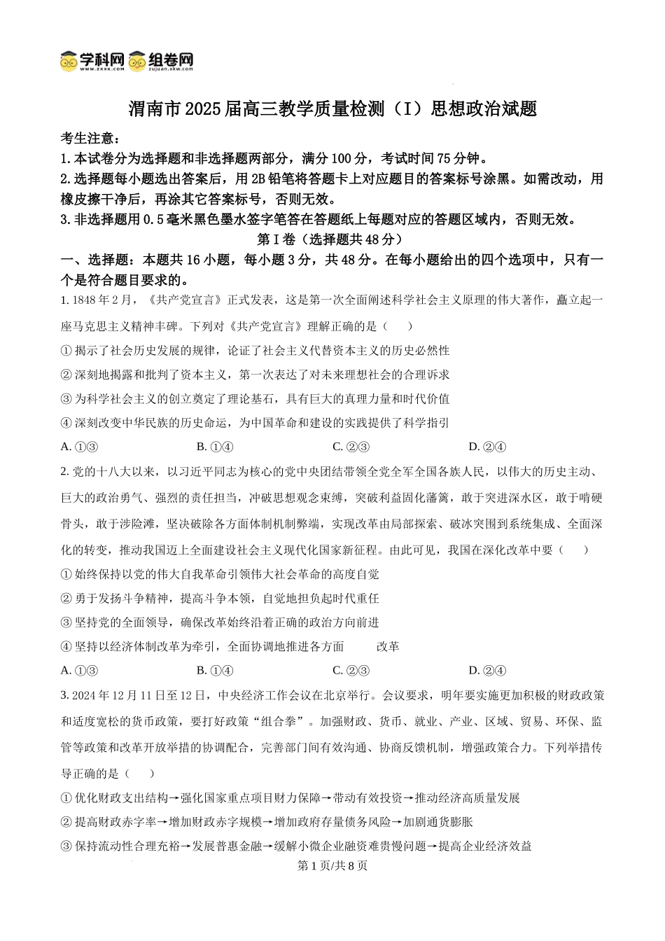 渭南市2025届高三教学质量检测(I)思想政治斌题考生注意:1.本试卷分为选择题和非选择题两部分,满分100分,考试时间75分钟。2.选择题每小题选出答案后,用2B铅笔将答题卡上对应题目的答案标号涂黑。如需改动,...