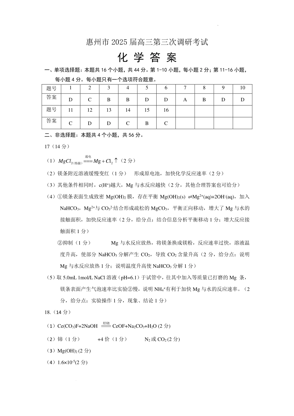 广东省惠州市2025届高三第三次调研考试(惠州三调)化学答案.pdf_第1页