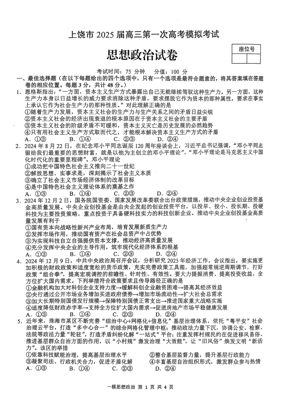 上饶市2025届高三第一次高考模拟考试政治试卷.pdf