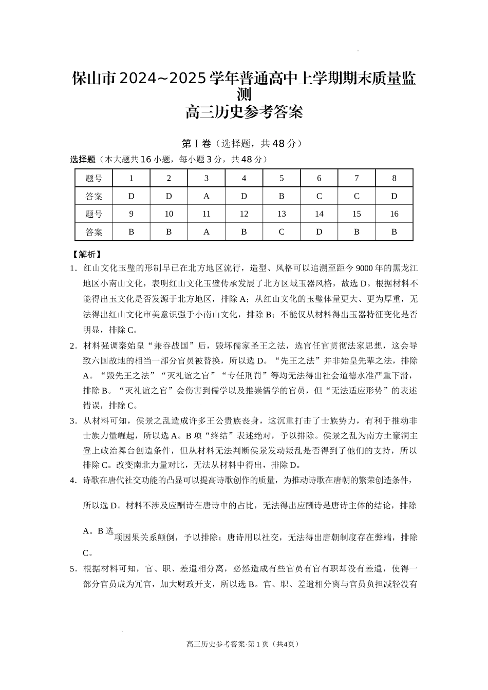 保山市2024~2025学年普通高中上学期期末质量监测高三历史参考答案第Ⅰ卷(选择题,共48分)选择题(本大题共16小题,每小题3分,共48分)题号12345678答案DDADBCCD题号910111213141516答案BBABCDBB【解析】1.红...