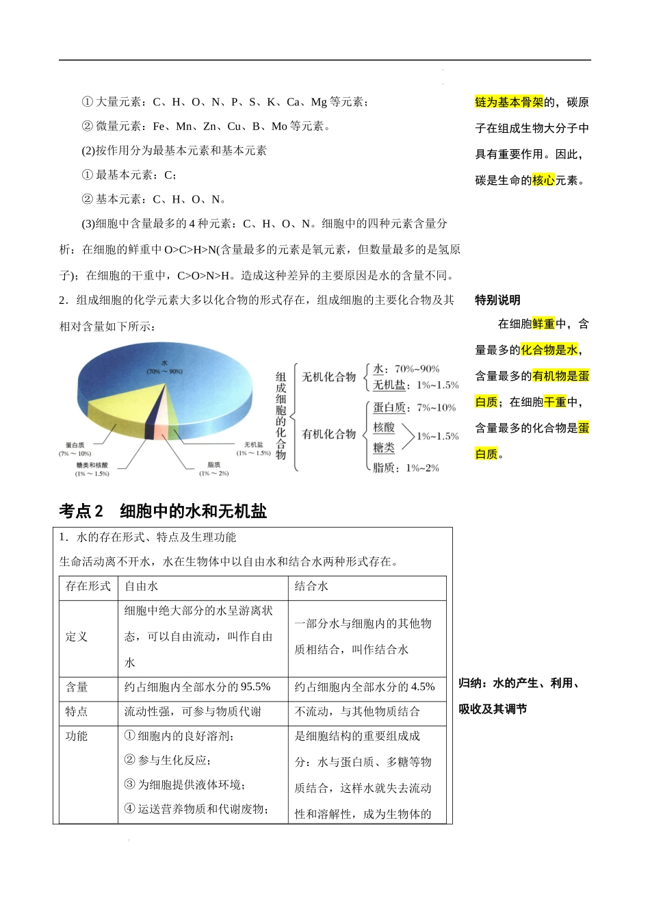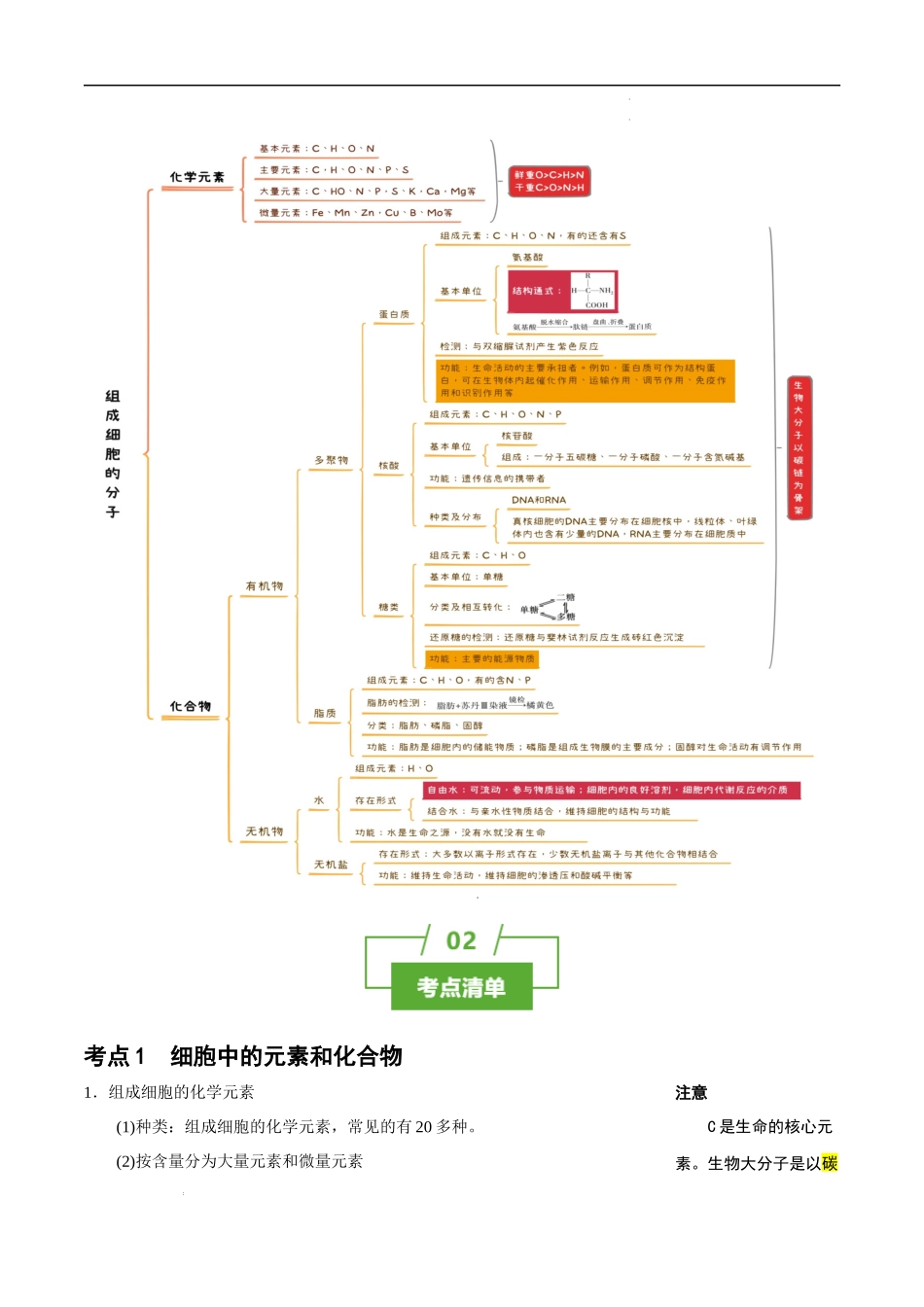 知识清单02组成细胞的分子内容概览知识导图:感知全局,了解知识要点考点清单:6大考点总结,梳理必背知识、归纳重点易混易错:10个错混点梳理,高效查漏补缺真题赏析:感知真题、知识链接、知己知彼学科网(北京...