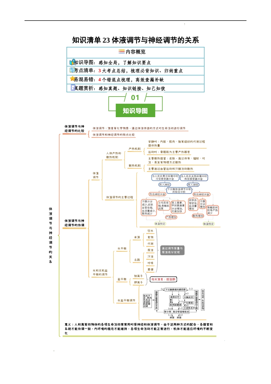 知识清单23体液调节与神经调节的关系内容概览知识导图:感知全局,了解知识要点考点清单:3大考点总结,梳理必背知识、归纳重点易混易错:4个错混点梳理,高效查漏补缺真题赏析:感知真题、知识链接、知己知彼学...