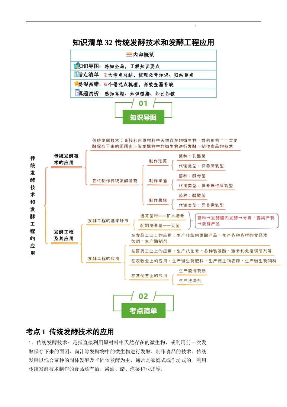知识清单32传统发酵技术和发酵工程应用内容概览知识导图:感知全局,了解知识要点考点清单:2大考点总结,梳理必背知识、归纳重点易混易错:6个错混点梳理,高效查漏补缺真题赏析:感知真题、知识链接、知己知彼...