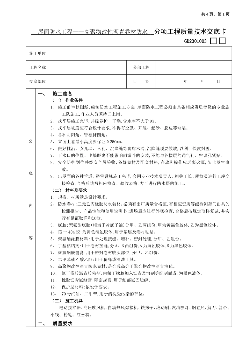 共4页,第1页屋面防水工程——高聚物改性沥青卷材防水分项工程质量技术交底卡GD2301003施工单位工程名称分部工程交底部位日期年月日交底内容一、施工准备(一)作业条件1、施工前审核图纸,编制防水工程施工方案;...