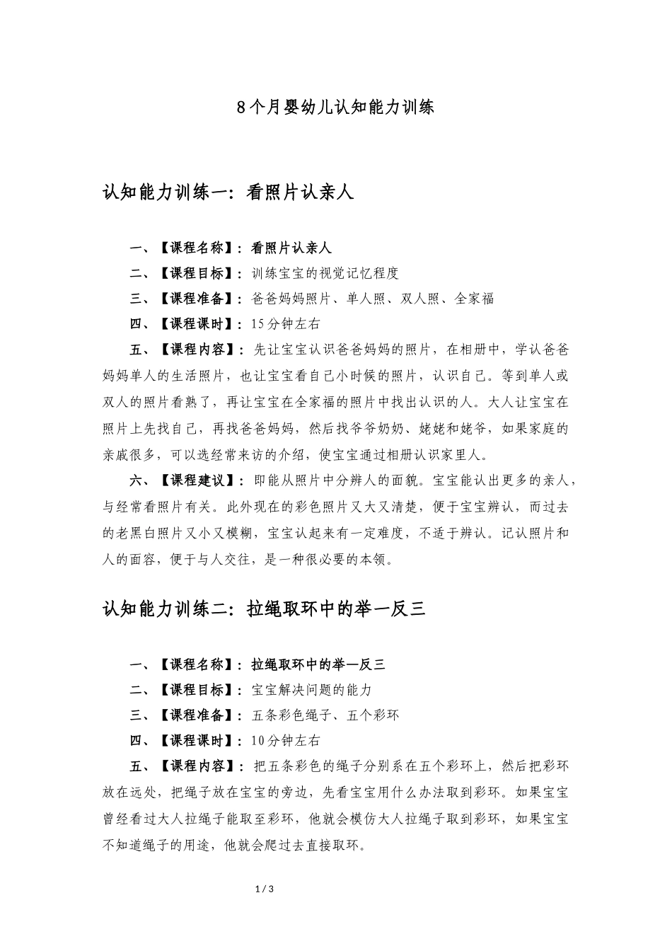 1/38个月婴幼儿认知能力训练认知能力训练一:看照片认亲人一、【课程名称】:看照片认亲人二、【课程目标】:训练宝宝的视觉记忆程度三、【课程准备】:爸爸妈妈照片、单人照、双人照、全家福四、【课程课时】:1...