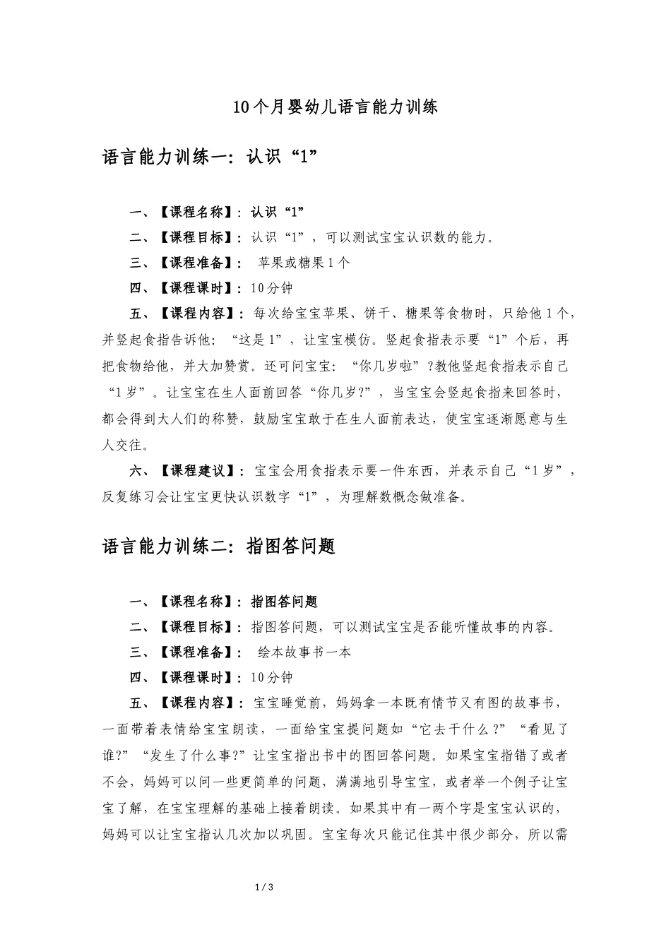 1/310个月婴幼儿语言能力训练语言能力训练一:认识“1”一、【课程名称】:认识“1”二、【课程目标】:认识“1”,可以测试宝宝认识数的能力。三、【课程准备】:苹果或糖果1个四、【课程课时】:10分钟五、【课...