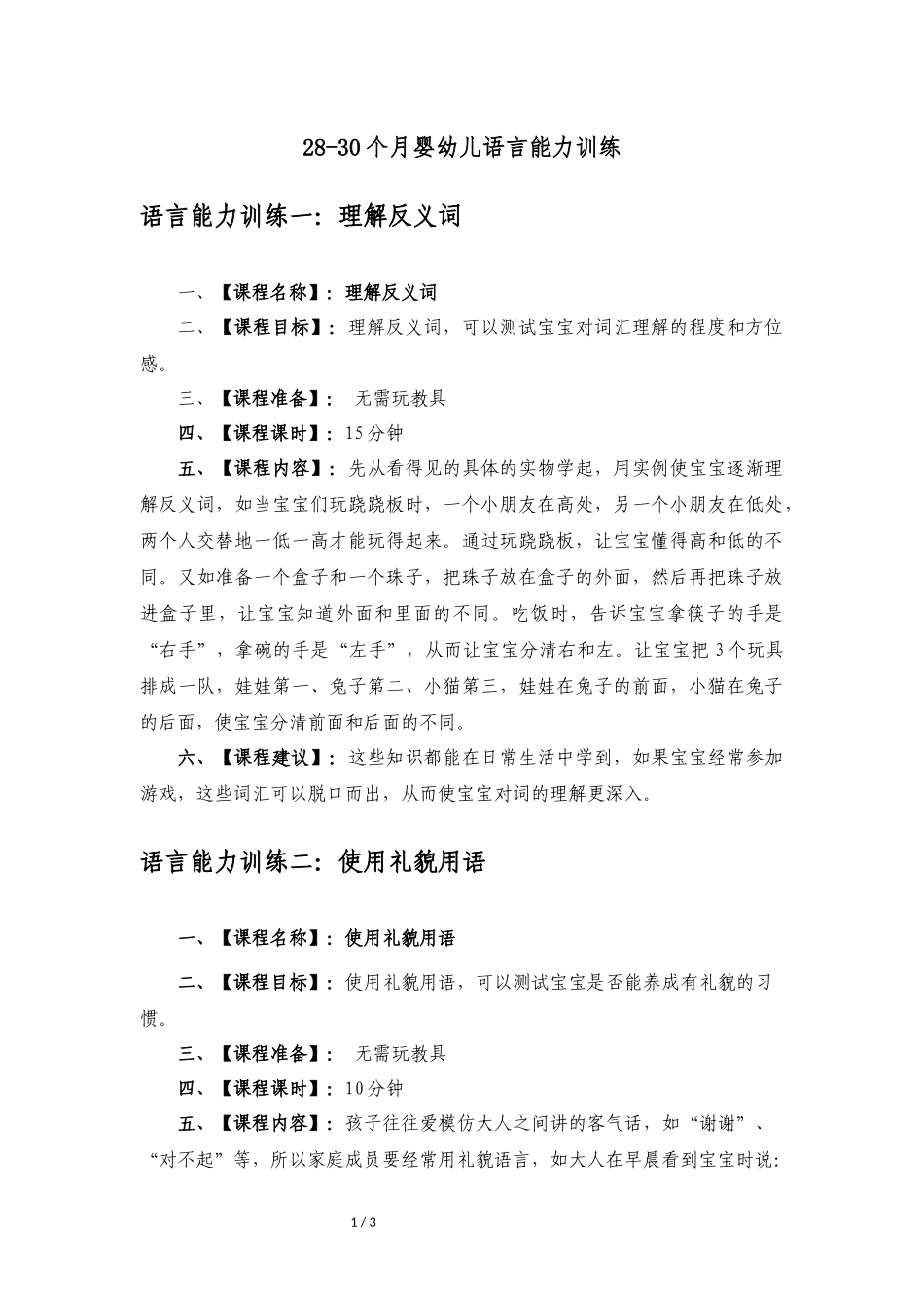 1/328-30个月婴幼儿语言能力训练语言能力训练一:理解反义词一、【课程名称】:理解反义词二、【课程目标】:理解反义词,可以测试宝宝对词汇理解的程度和方位感。三、【课程准备】:无需玩教具四、【课程课时】...