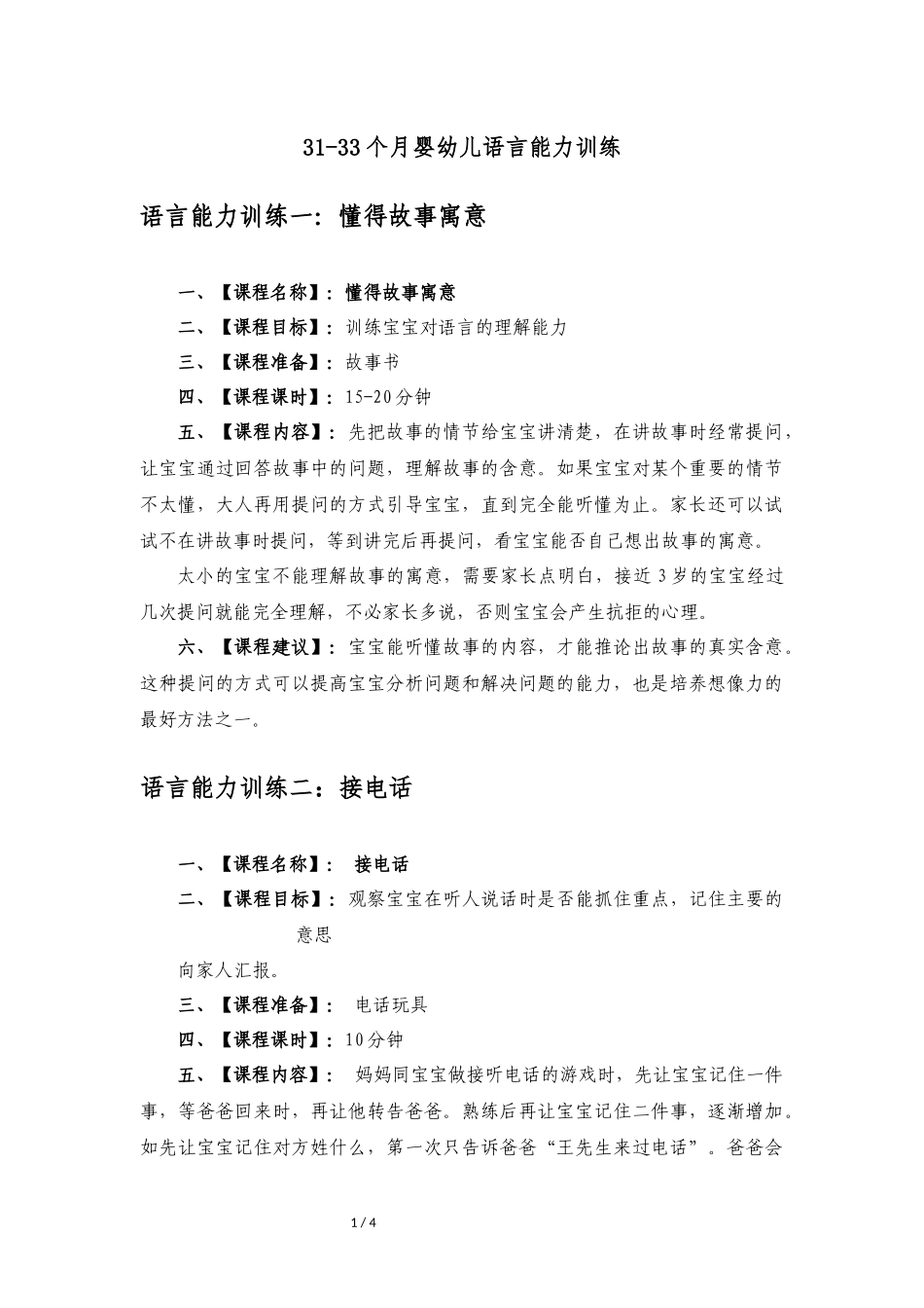 1/431-33个月婴幼儿语言能力训练语言能力训练一:懂得故事寓意一、【课程名称】:懂得故事寓意二、【课程目标】:训练宝宝对语言的理解能力三、【课程准备】:故事书四、【课程课时】:15-20分钟五、【课程内容】...