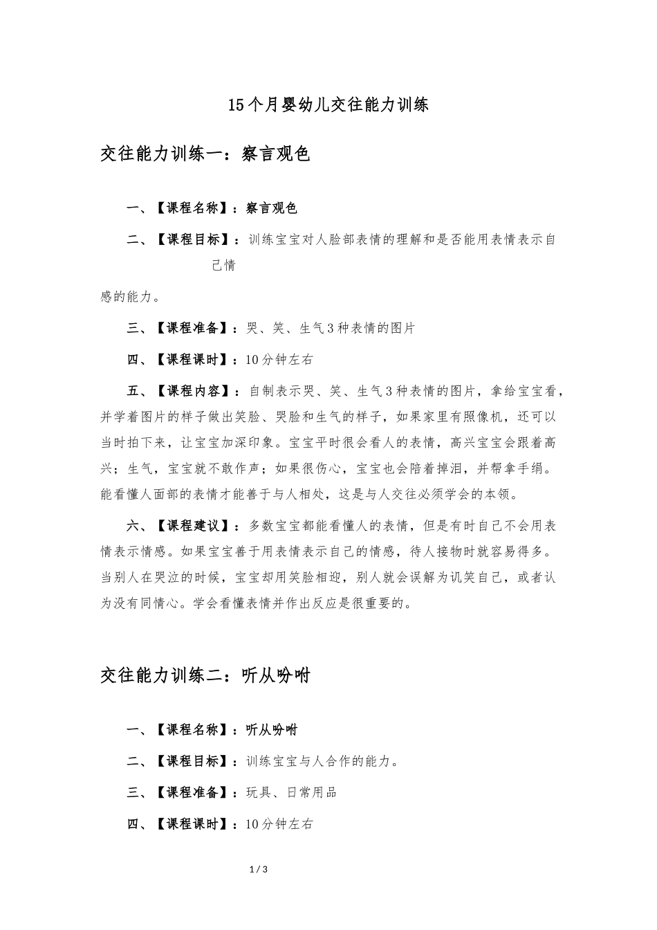 1/315个月婴幼儿交往能力训练交往能力训练一:察言观色一、【课程名称】:察言观色二、【课程目标】:训练宝宝对人脸部表情的理解和是否能用表情表示自己情感的能力。三、【课程准备】:哭、笑、生气3种表情的图...
