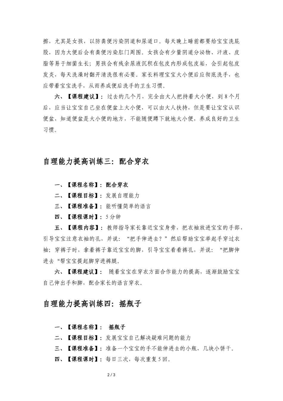 1/38个月婴幼儿自理能力训练自理能力训练一:穿衣第一步一、【课程名称】:穿衣第一步二、【课程目标】:训练宝宝的穿衣自理能力三、【课程准备】:衣服四、【课程课时】:10-15分钟五、【课程内容】:每天替宝宝...