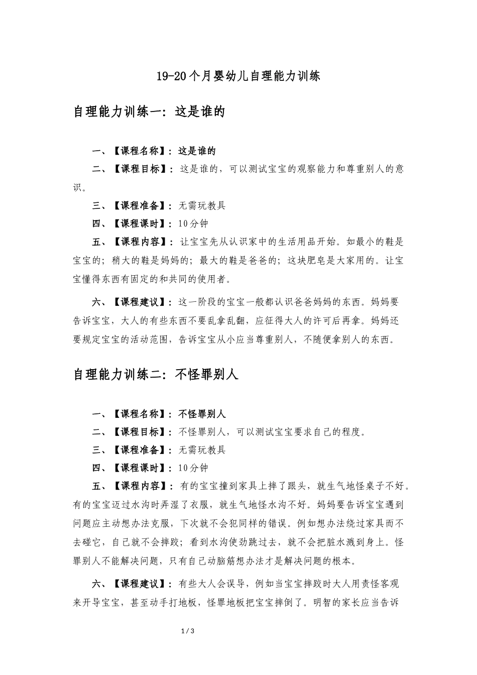 1/319-20个月婴幼儿自理能力训练自理能力训练一:这是谁的一、【课程名称】:这是谁的二、【课程目标】:这是谁的,可以测试宝宝的观察能力和尊重别人的意识。三、【课程准备】:无需玩教具四、【课程课时】:10...
