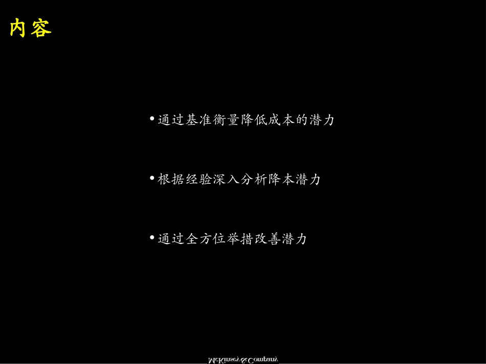 机密2001年10月17日降低成本的一些分析方法2内容•通过基准衡量降低成本的潜力•根据经验深入分析降本潜力•通过全方位举措改善潜力3内容•通过基准衡量降低成本的潜力•根据经验深入分析降本潜力•通过全方位举...