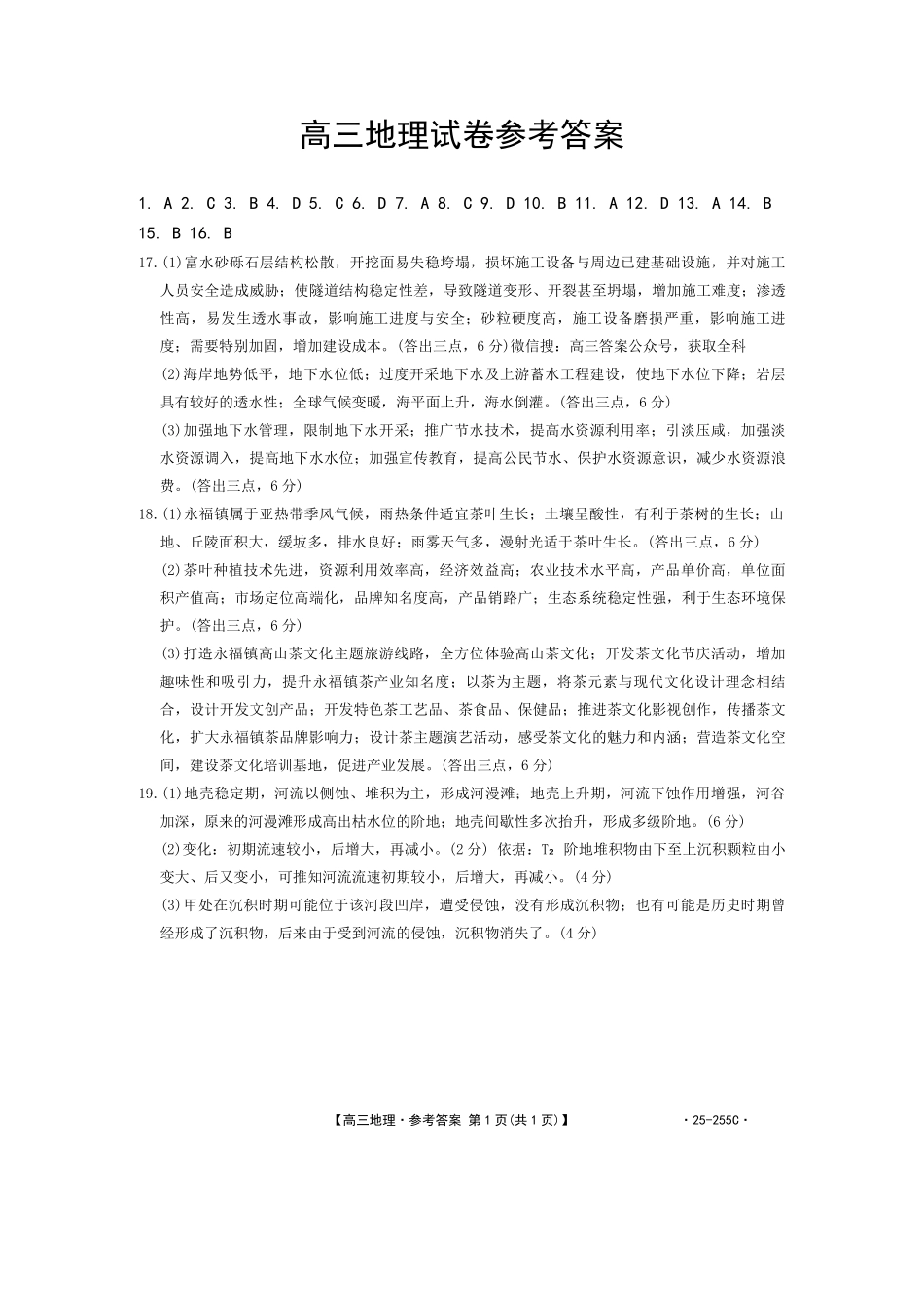 高三地理试卷参考答案1.A2.C3.B4.D5.C6.D7.A8.C9.D10.B11.A12.D13.A14.B15.B16.B17.(1)富水砂砾石层结构松散,开挖面易失稳垮塌,损坏施工设备与周边已建基础设施,并对施工人员安全造成威胁;使隧道结构稳定性差...