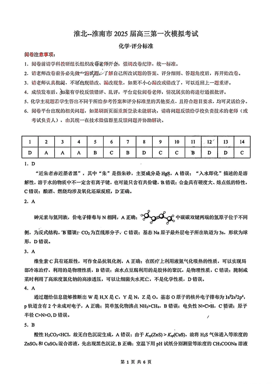 安徽省淮南市、淮北市2025届高三上学期第一次质量检测化学答案.pdf_第1页