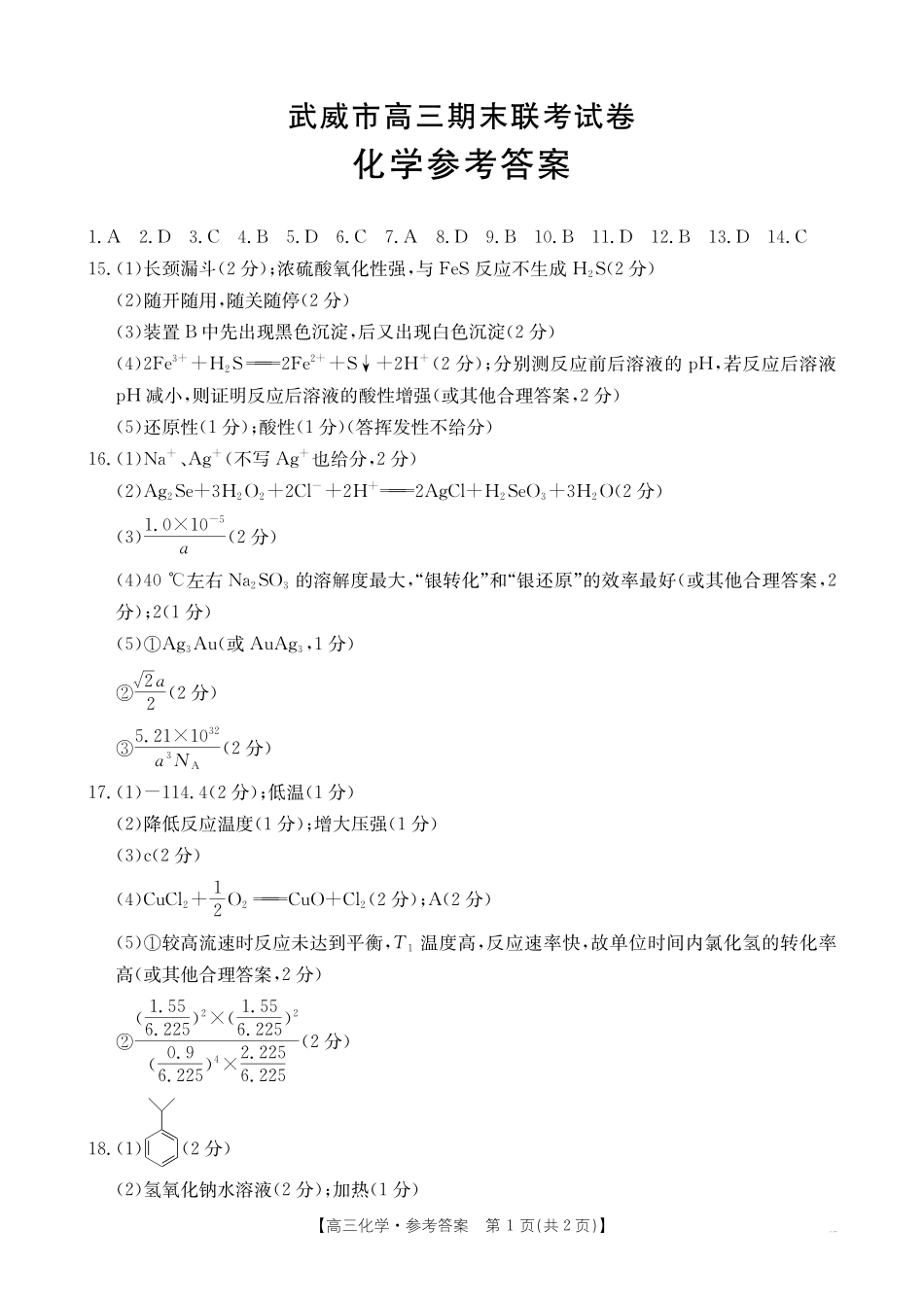 甘肃省武威市2025届高三上学期1月期末联考化学答案.pdf