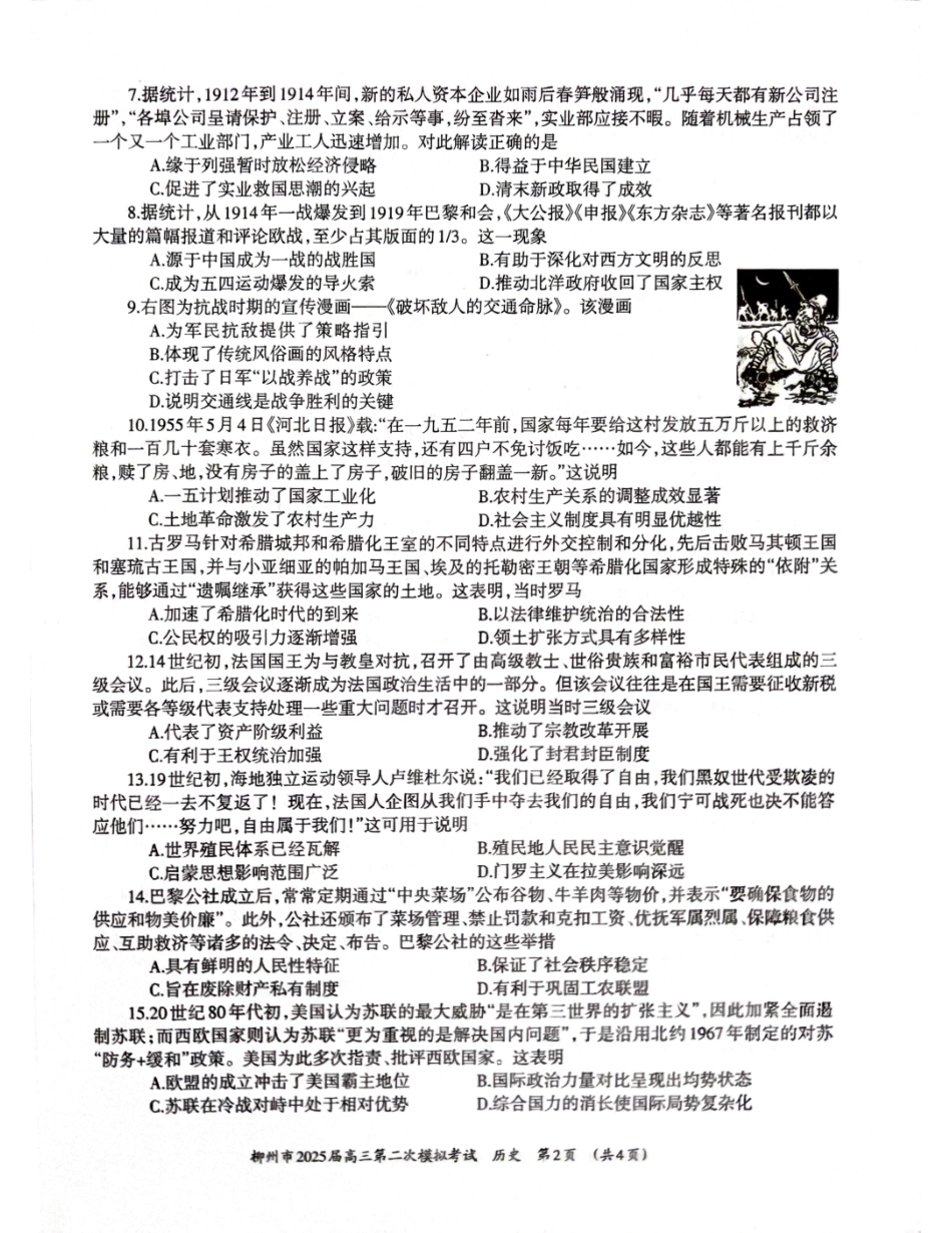 广西柳州市2025届高三第二次模拟考试历史试卷.pdf