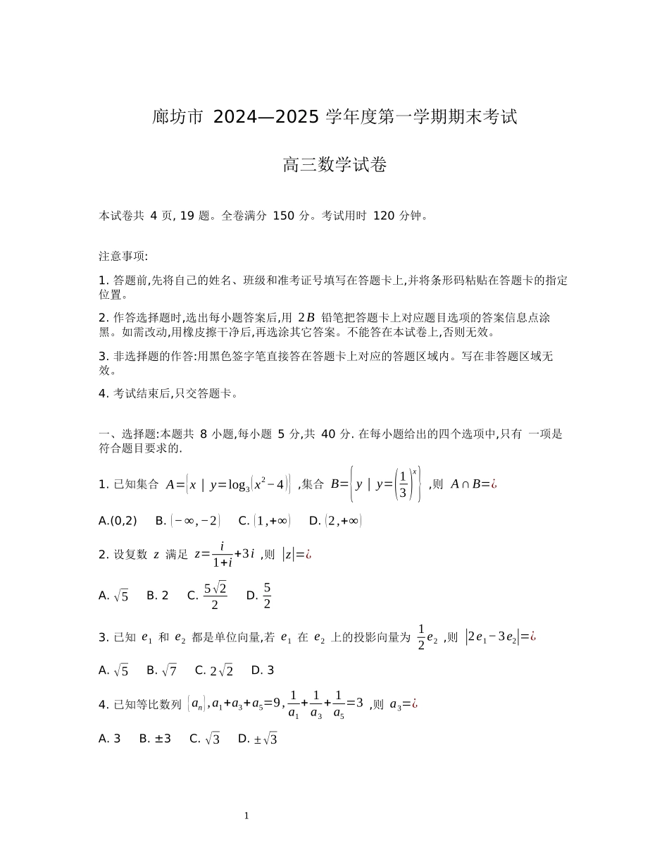 1廊坊市2024—2025学年度第一学期期末考试高三数学试卷本试卷共4页,19题。全卷满分150分。考试用时120分钟。注意事项:1.答题前,先将自己的姓名、班级和准考证号填写在答题卡上,并将条形码粘贴在答题卡的指定位置...