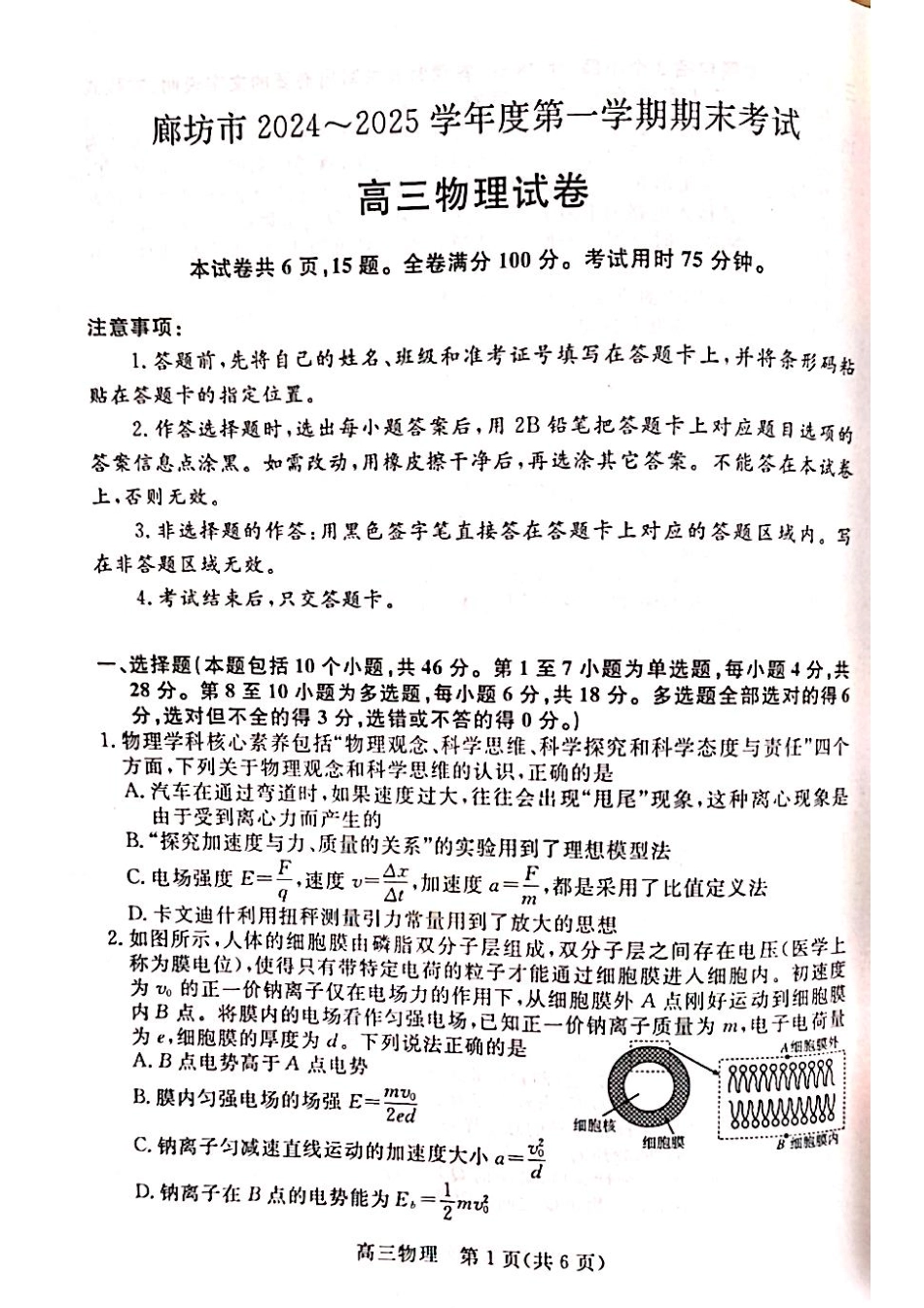 河北省廊坊市 2024~2025学年度高三第一学期期末考试物理.pdf_第2页