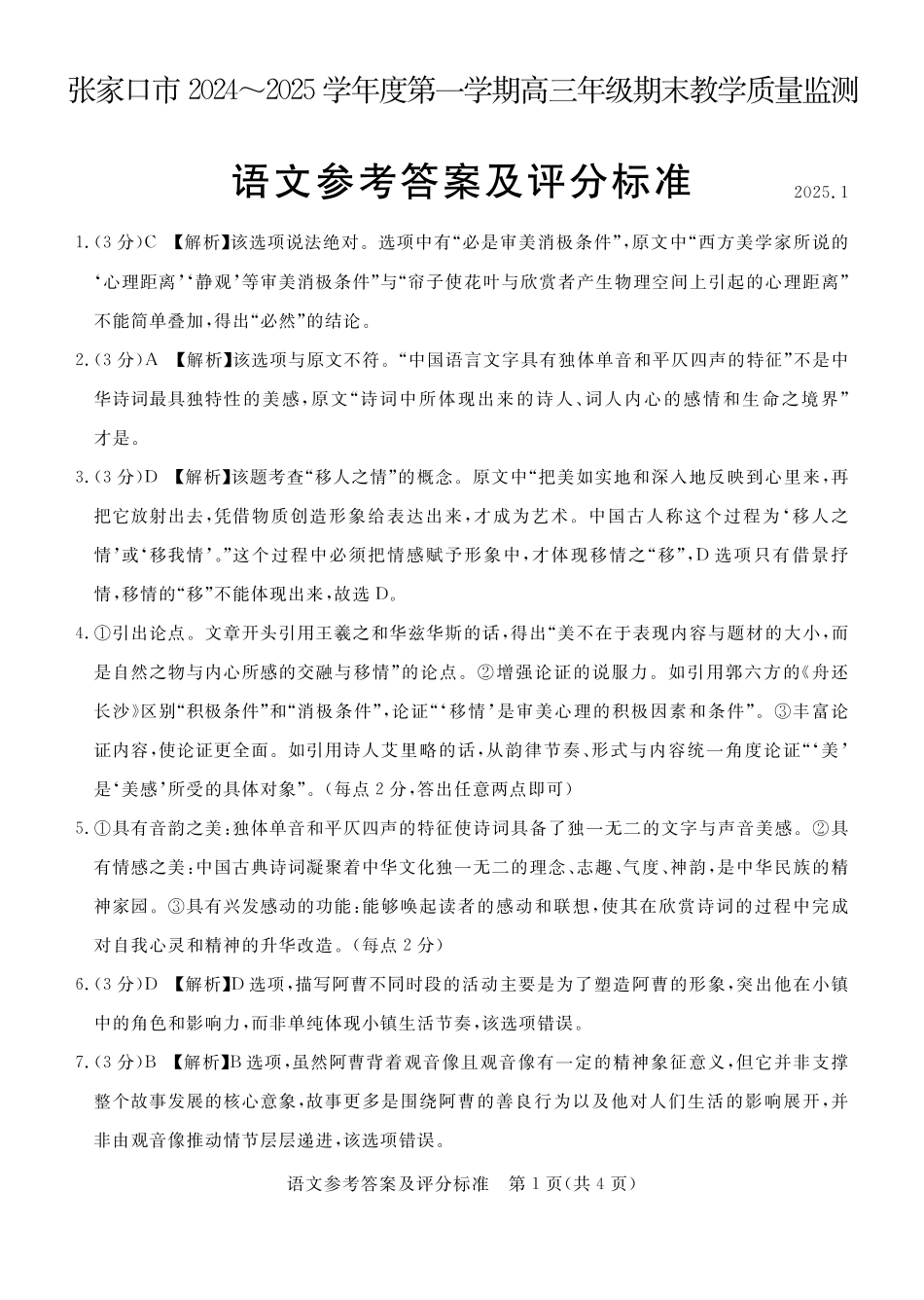 河北省张家口市2024~2025学年高三上学期期末教学质量监测语文答案.pdf_第1页