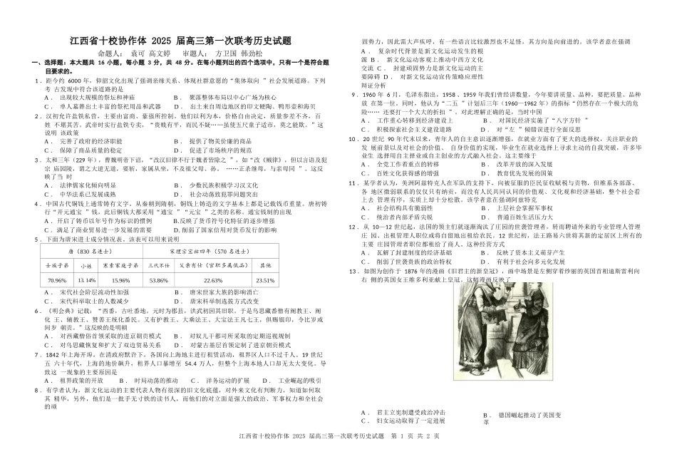 江西省十校协作体2025届高三第一次联考历史试题命题人:袁可高文婷审题人:方卫国韩劲松一、选择题:本大题共16小题,每小题3分,共48分。在每小题列出的四个选项中,只有一个是符合题目要求的。1.距今约6000年...