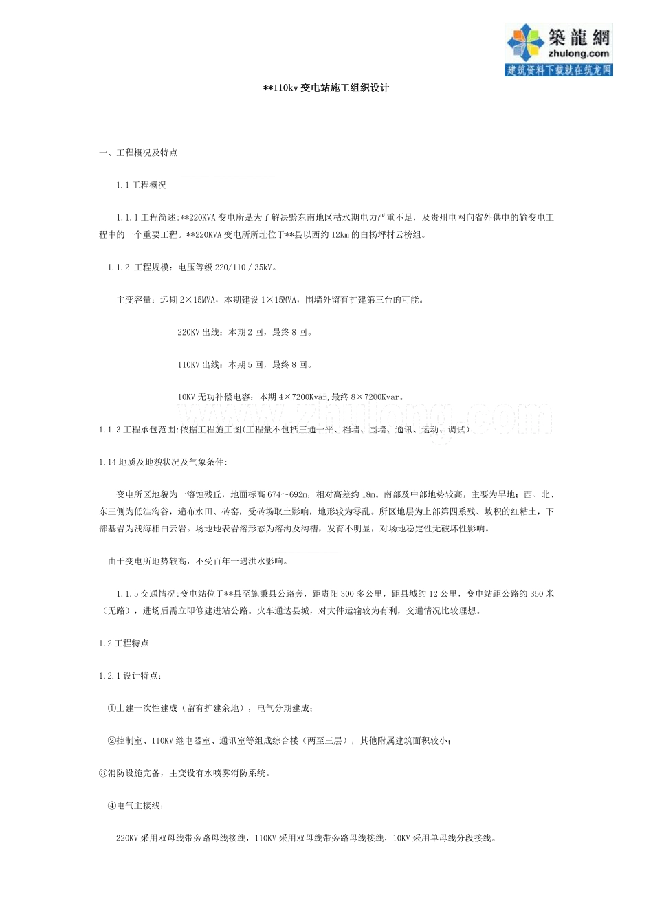 **110kv变电站施工组织设计一、工程概况及特点1.1工程概况1.1.1工程简述:**220KVA变电所是为了解决黔东南地区枯水期电力严重不足,及贵州电网向省外供电的输变电工程中的一个重要工程。**220KVA变电所所址位于**...