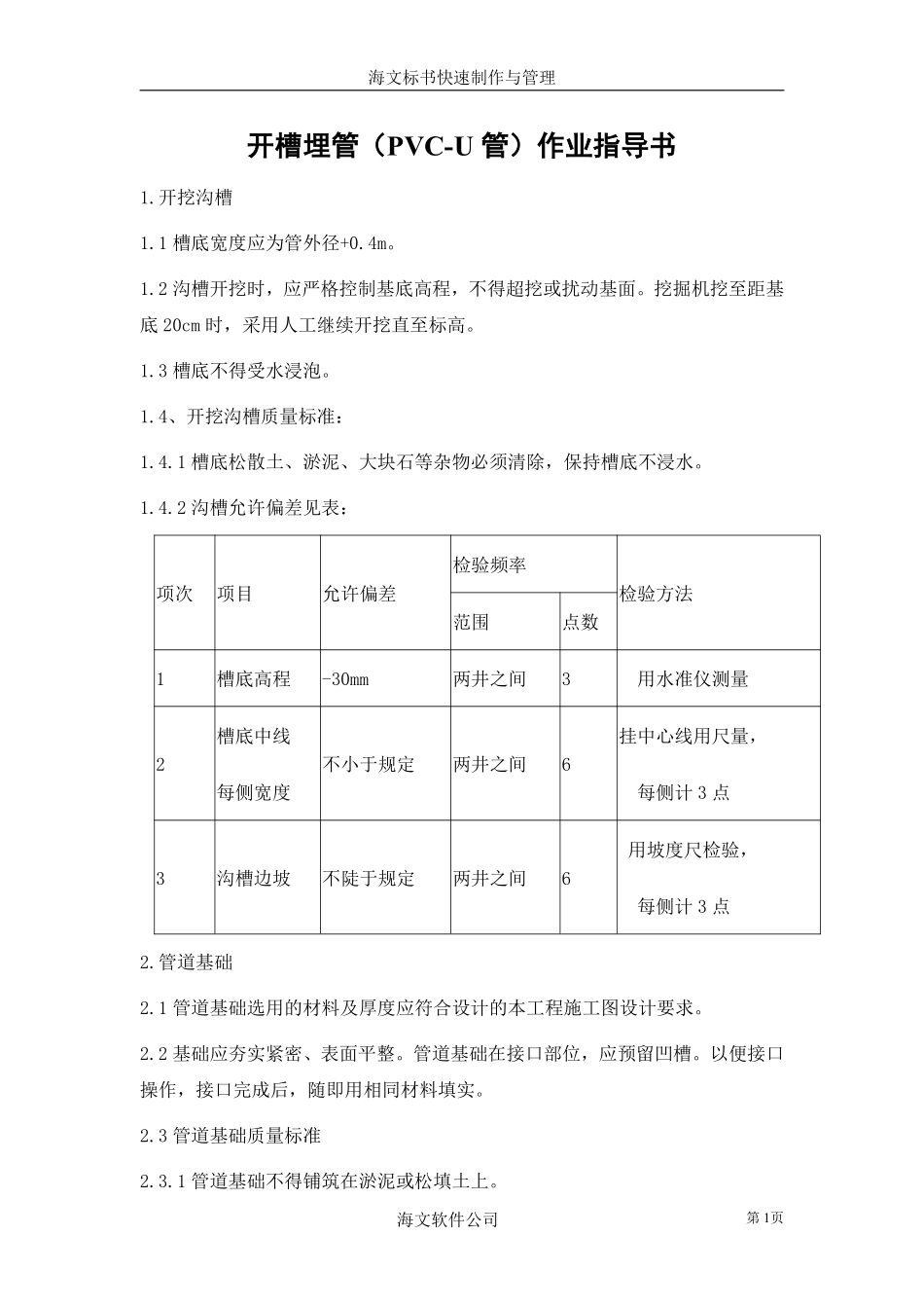 海文标书快速制作与管理海文软件公司第1页开槽埋管(PVC-U管)作业指导书1.开挖沟槽1.1槽底宽度应为管外径+0.4m。1.2沟槽开挖时,应严格控制基底高程,不得超挖或扰动基面。挖掘机挖至距基底20cm时,采用人工继续...
