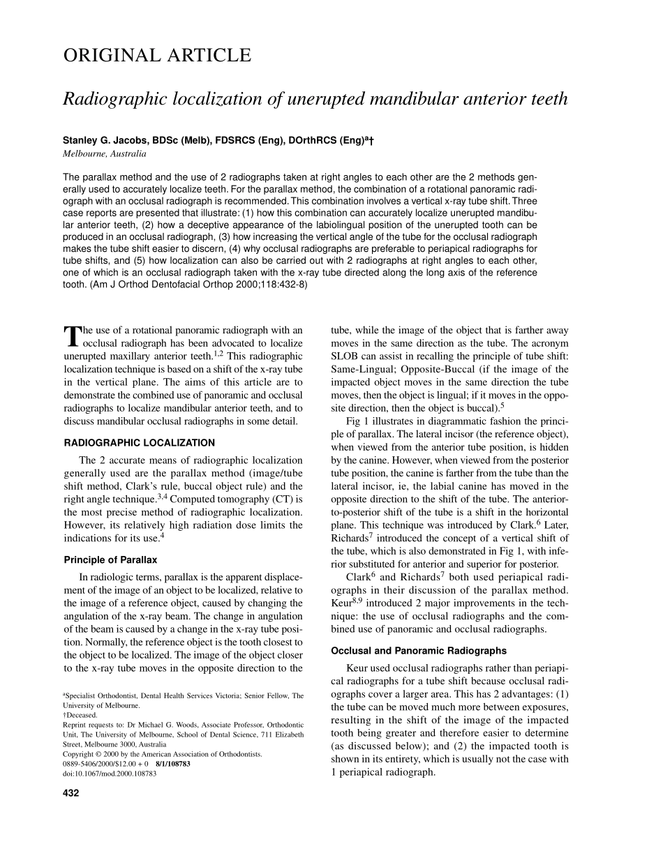 432Theuseofarotationalpanoramicradiographwithanocclusalradiographhasbeenadvocatedtolocalizeuneruptedmaxillaryanteriorteeth.1,2Thisradiographiclocalizationtechniqueisbasedonashiftofthex-raytubeinthe...