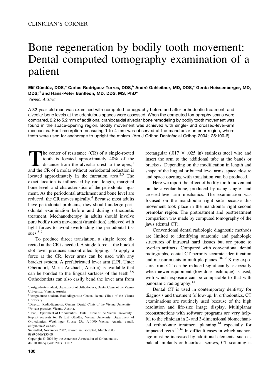 CLINICIAN’SCORNERBoneregenerationbybodilytoothmovement:DentalcomputedtomographyexaminationofapatientElifGu¨ndu¨z,DDS,aCarlosRodrı´guez-Torres,DDS,bAndre´Gahleitner,MD,DDS,cGerdaHeissenberger,...