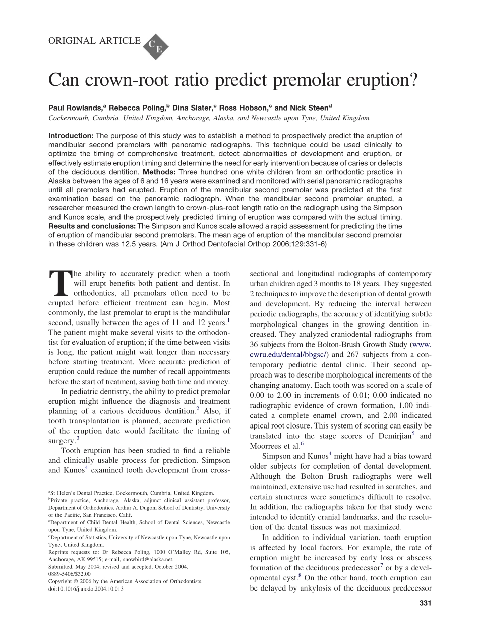 ORIGINALARTICLECancrown-rootratiopredictpremolareruption?PaulRowlands,aRebeccaPoling,bDinaSlater,cRossHobson,candNickSteendCockermouth,Cumbria,UnitedKingdom,Anchorage,Alaska,andNewcastleuponTyne,Un...
