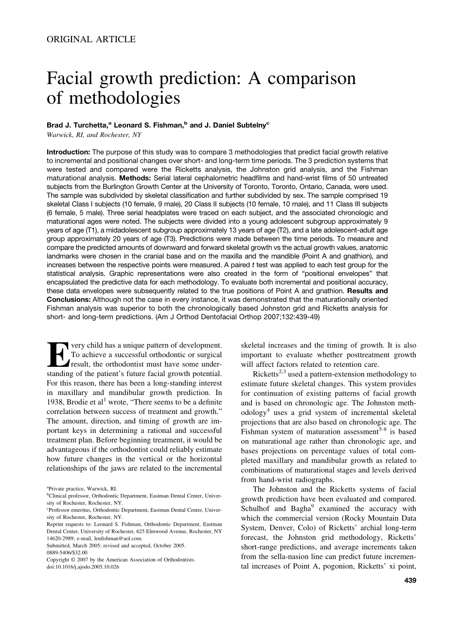 ORIGINALARTICLEFacialgrowthprediction:AcomparisonofmethodologiesBradJ.Turchetta,aLeonardS.Fishman,bandJ.DanielSubtelnycWarwick,RI,andRochester,NYIntroduction:Thepurposeofthisstudywastocompare3metho...