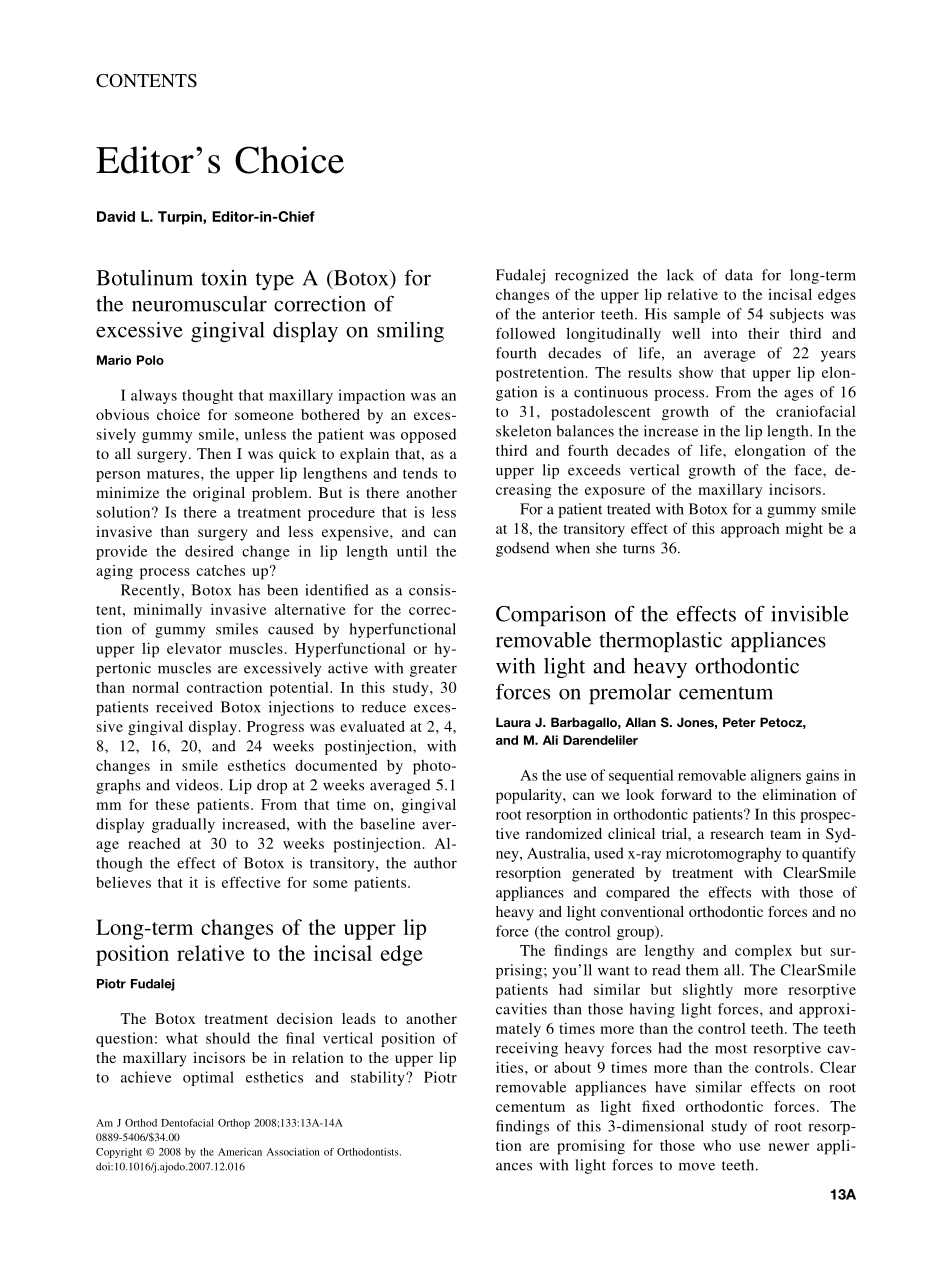 CONTENTSEditor’sChoiceDavidL.Turpin,Editor-in-ChiefBotulinumtoxintypeA(Botox)fortheneuromuscularcorrectionofexcessivegingivaldisplayonsmilingMarioPoloIalwaysthoughtthatmaxillaryimpactionwasanobvio...
