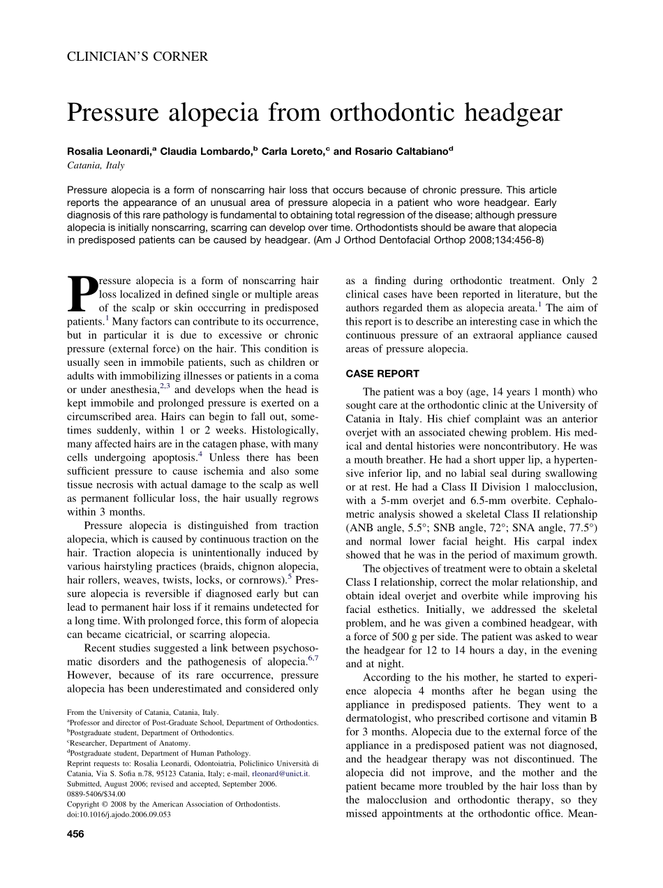 CLINICIAN’SCORNERPressurealopeciafromorthodonticheadgearRosaliaLeonardi,aClaudiaLombardo,bCarlaLoreto,candRosarioCaltabianodCatania,ItalyPressurealopeciaisaformofnonscarringhairlossthatoccursbecau...