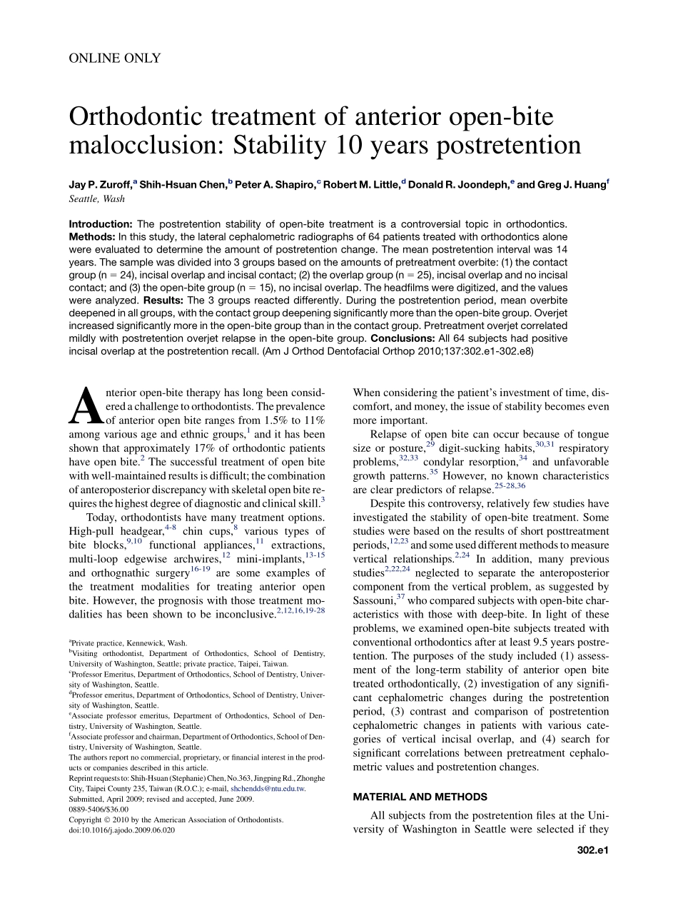 ONLINEONLYOrthodontictreatmentofanterioropen-bitemalocclusion:Stability10yearspostretentionJayP.Zuroff,aShih-HsuanChen,bPeterA.Shapiro,cRobertM.Little,dDonaldR.Joondeph,eandGregJ.HuangfSeattle,Wash...