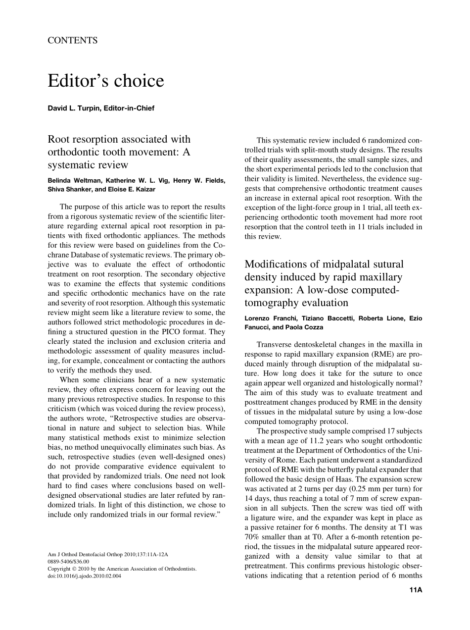 CONTENTSEditor’schoiceDavidL.Turpin,Editor-in-ChiefRootresorptionassociatedwithorthodontictoothmovement:AsystematicreviewBelindaWeltman,KatherineW.L.Vig,HenryW.Fields,ShivaShanker,andEloiseE.Kaiza...
