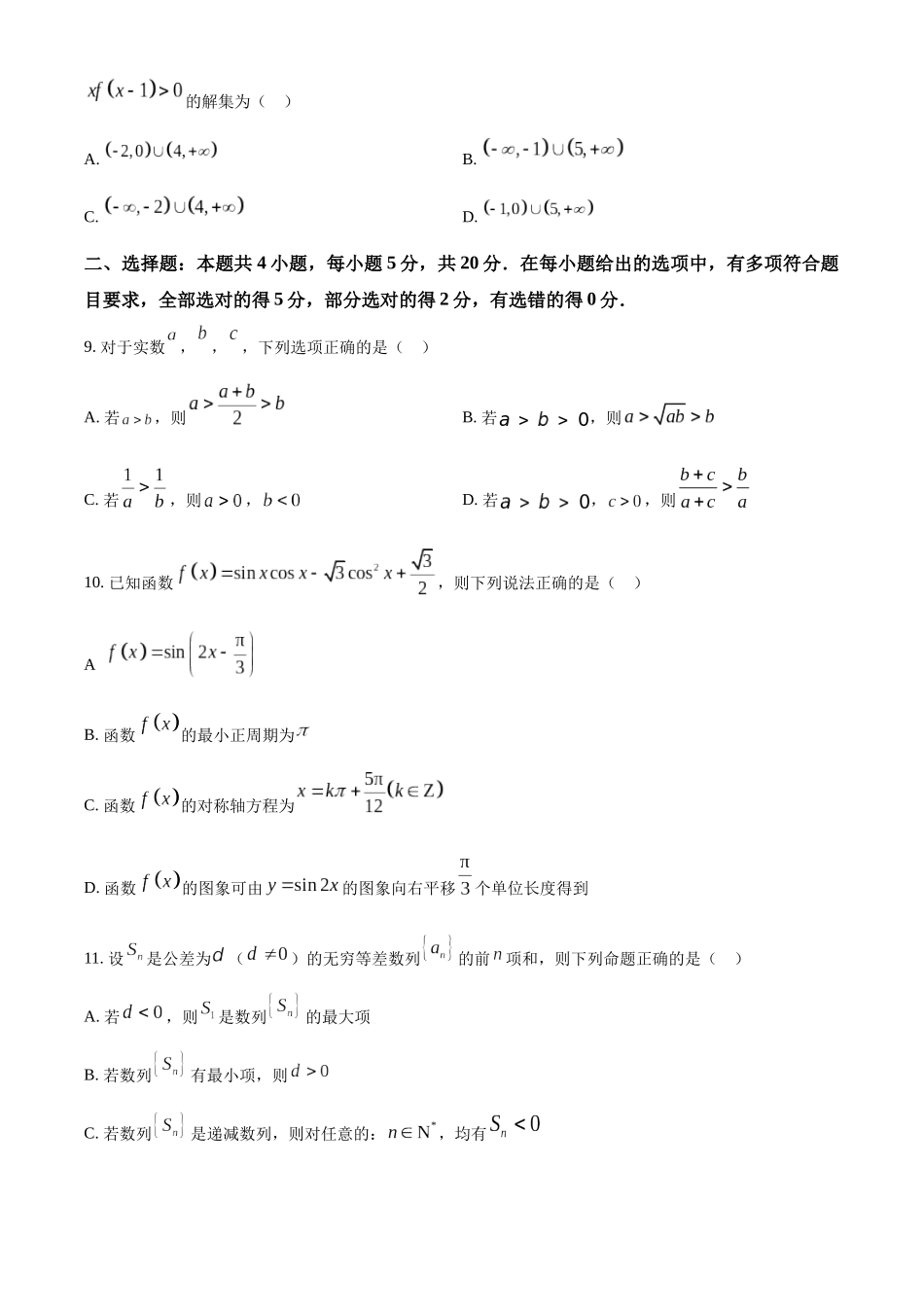 湖南省长沙市雅礼中学2024届高三上学期月考(二)数学试题(原卷版).docx_第2页