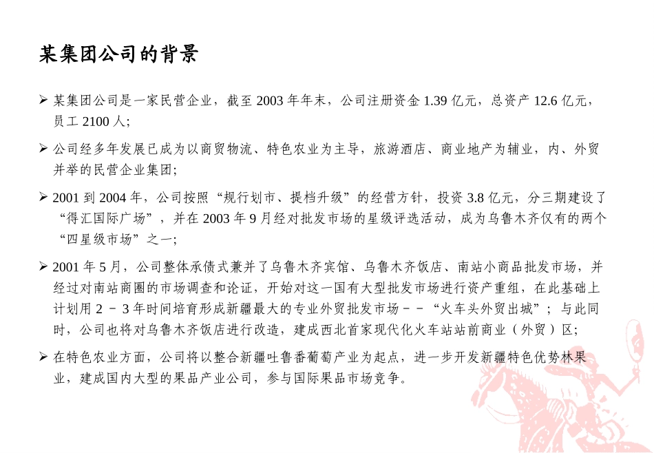 某集团公司股权结构改革设计咨询项目建议书目录一、项目背景和目标二、项目的内容和思路三、项目工作步骤和工作成果四、项目安排及运作方式某集团公司的背景某集团公司是一家民营企业,截至2003年年末,公司注...