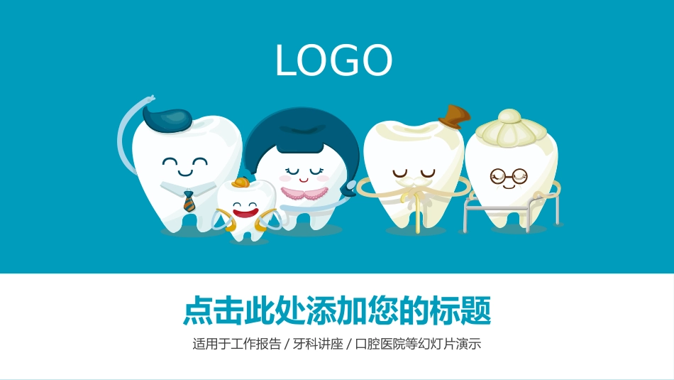 LOGO适用于工作报告/牙科讲座/口腔医院等幻灯片演示点击此处添加您的标题牙科护理图标Dentalcare(图标可以拆分、修改颜色等)在此录入您的内容,或者通过复制您的文本后,在此框中选择粘贴,并选择只保留文字。...