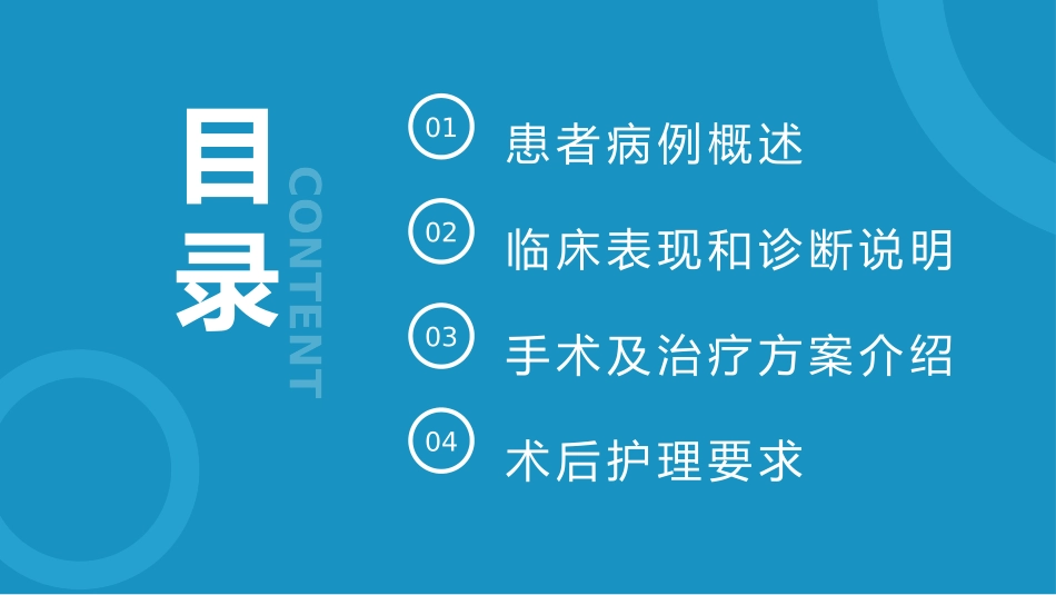 2021医疗行业临床报告工作计划|指标汇报|总结汇报|年度总结汇报人:宜欣颖汇报时间:20XX.X.XX关注医疗健康生活患者病例概述临床表现和诊断说明手术及治疗方案介绍术后护理要求目录CONTENT01020304关注医疗健康生...