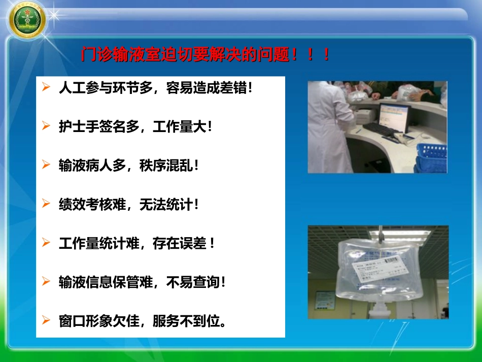 门诊移动输液系统简介急诊科侯玉娟传统门诊输液的工作流程传统门诊输液的工作流程多个环节需要人工干涉核对;输液单和输液标签需要人工生成门诊输液室迫切要解决的问题!!!门诊输液室迫切要解决的问题!!!...