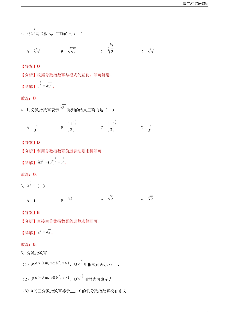 淘宝:中院研究所5.1.1有理数指数幂分层作业1.已知,则x等于()A.B.C.D.【答案】B【分析】由指数幂与根式的关系,结合对应根次数确定根即可.【详解】因为7为奇数,8的7次方根只有一个,为.故选:B2.(),...