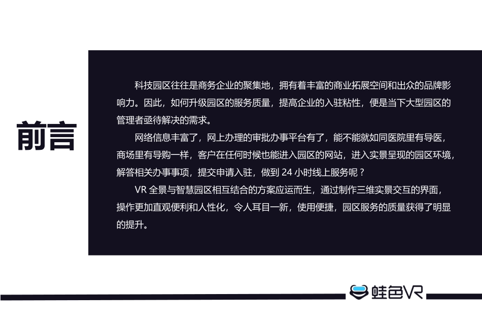 智慧园区VR全景解决方案上海蛙色网络科技有限公司前言科技园区往往是商务企业的聚集地,拥有着丰富的商业拓展空间和出众的品牌影响力。因此,如何升级园区的服务质量,提高企业的入驻粘性,便是当下大型园区的管...