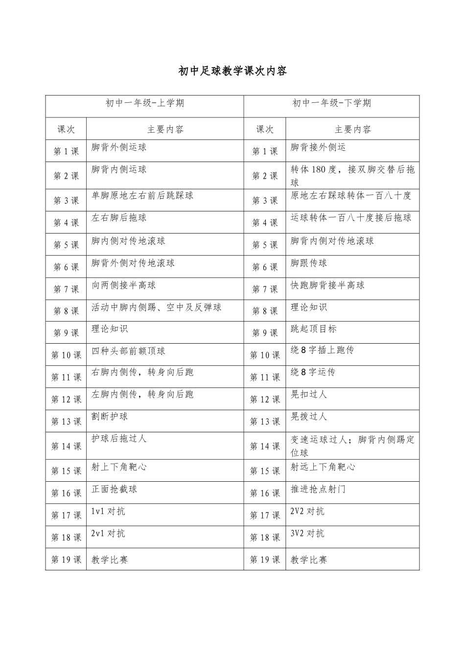 初中足球教学课次内容初中一年级-上学期初中一年级-下学期课次主要内容课次主要内容第1课脚背外侧运球第1课脚背接外侧运第2课脚背内侧运球第2课转体180度,接双脚交替后拖球第3课单脚原地左右前后跳踩球第3课原地...