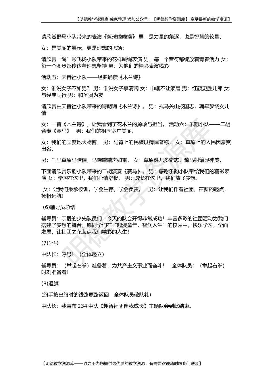 【明德教学资源库独家整理添加公众号:【明德教学资源库】享受最新的教学资源】校园文化活动我参与——“趣智社团伴我成长”——234中队主题队会活动一、活动背景为了弘扬学校的“趣智”社团文化,结合我校社团活...