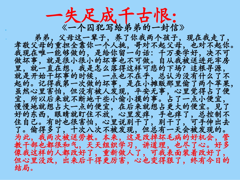 勿以恶小而为之——法在我心中《一个囚犯写给弟弟的一封信》弟弟,父母这一辈子,养了你我两个孩子,现在我走了,孝敬父母的重担全靠你一个人挑,哥对不起父母,也对不起你。我现在唯一能够做的,是给你留一...