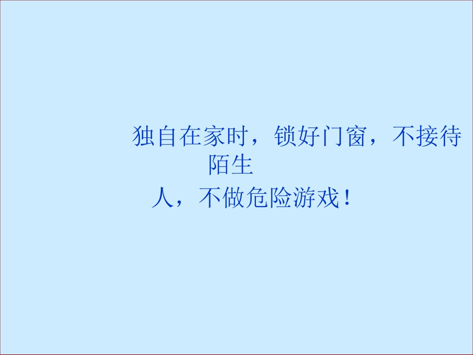 独自在家时,锁好门窗,不接待陌生人,不做危险游戏!调查一下,哪些邻居经常在家,他家的电话号码是多少,遇到危险时可以向他们寻求帮助。你会打报警电话吗?案例一:05年夏天,虹口一中学生独自在家,一陌生外...